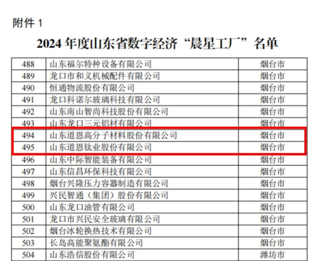 近日,山東省工信廳公布2024年度山東省數字經濟“晨星工廠”名單,道恩股份、道恩鈦業公司雙雙名列其中。