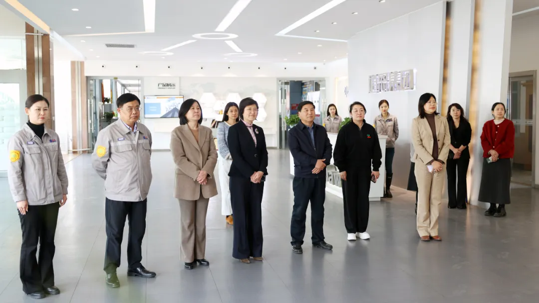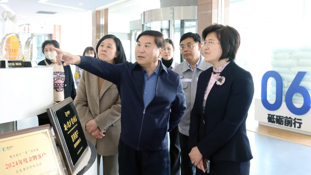 在道恩集團總部大廳,李少娜主席聽取了有關企業發展、產業布局、行業地位、科技創新及社會責任等情況介紹,對企業高質量發展成果表示贊賞,特別肯定了女職工在科技創新、管理提升等關鍵崗位發揮的“半邊天”作用。