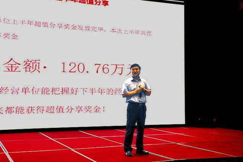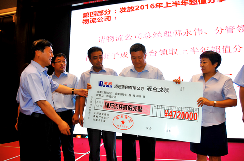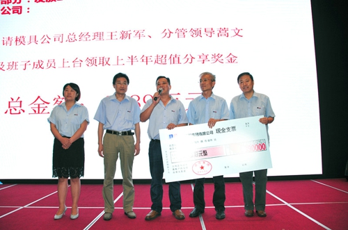 集團公司副總裁王永放介紹了2016年經營單位薪酬架構及發放試行辦法、超值分享核算及發放辦法和預發超值分享核算及發放辦法。模具公司、物流公司、營銷中心、高材公司班子成員及分管領導依次上臺領取超值分享獎金。獲獎單位代表作了獲獎感言,并展示團隊士氣。當總額120余萬元的分享獎金發放完畢,大家報以長時間的熱烈掌聲。
