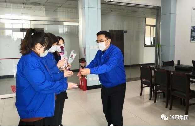 節日前夕,從集團公司總部到各職能部門,再到各經營單位,管理層親手把禮物送到女員工的手中,把深情的祝福送到大家心坎上。潤禾公司還組織了女員工座談會,對大家表示慰問和祝福。“鮮花祝福你們永遠年輕,口罩寓意大家身體健康,山楂預示著紅紅火火的未來,祝大家‘女神節’快樂!”道恩集團副總裁王永放親切的話語,讓女員工感到春天般的溫暖。