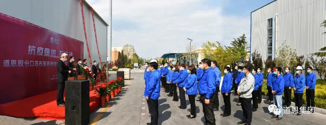 4月26日,道恩股份舉行口罩布聚丙烯熔噴料擴產項目投產儀式。該項目達產后,道恩股份(母公司)聚丙烯熔噴專用料日產量達到1200噸,可滿足12億只口罩的生產需要,最大限度助力國內疫情防控和復工復產,積極支援全球戰“疫”。