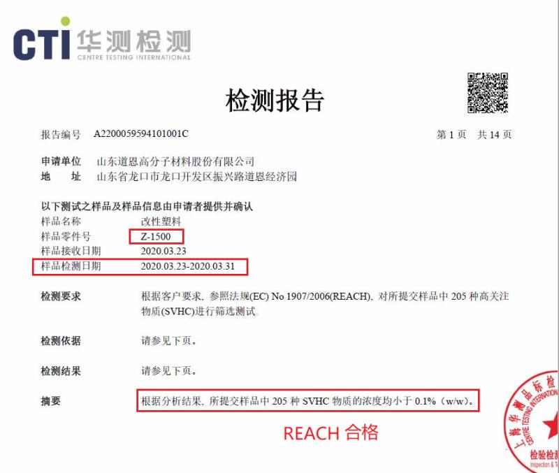 “經(jīng)過有害物質(zhì)注冊(cè)、評(píng)估、檢驗(yàn)后,在測(cè)試清單中205項(xiàng)有害物質(zhì)含量中均符合REACH的標(biāo)準(zhǔn)。這一突破性成果表明,道恩的產(chǎn)品在化學(xué)物質(zhì)指標(biāo)上達(dá)到了歐盟市場(chǎng)的要求。”田洪池總經(jīng)理說,此舉將有助于拓展國際市場(chǎng),提升道恩品牌國際化水平。