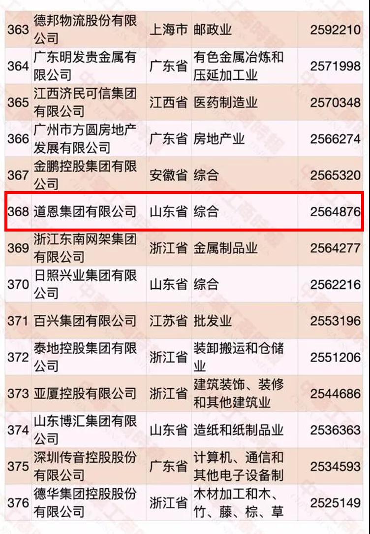 9月10日,全國工商聯公布了“2020年中國民營企業500強”名單,道恩集團榜上有名,位列368名,較去年提升了56個位次,多年來,公司排名穩步攀升,實現了高質量發展。