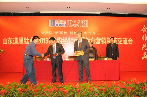 3月19日,被國(guó)家化工行業(yè)生產(chǎn)力促進(jìn)中心譽(yù)為國(guó)內(nèi)同行業(yè)樣板工程的道恩鈦業(yè)公司迎來(lái)了來(lái)自全國(guó)各地的54個(gè)鈦白粉經(jīng)銷(xiāo)商,參加山東道恩鈦業(yè)(2013)簽約經(jīng)銷(xiāo)商暨鈦白營(yíng)銷(xiāo)精英交流會(huì),鈦白專(zhuān)家、清華大學(xué)教授崔愛(ài)莉,中國(guó)化工報(bào)首席記者姜小毛也應(yīng)邀出席了會(huì)議。