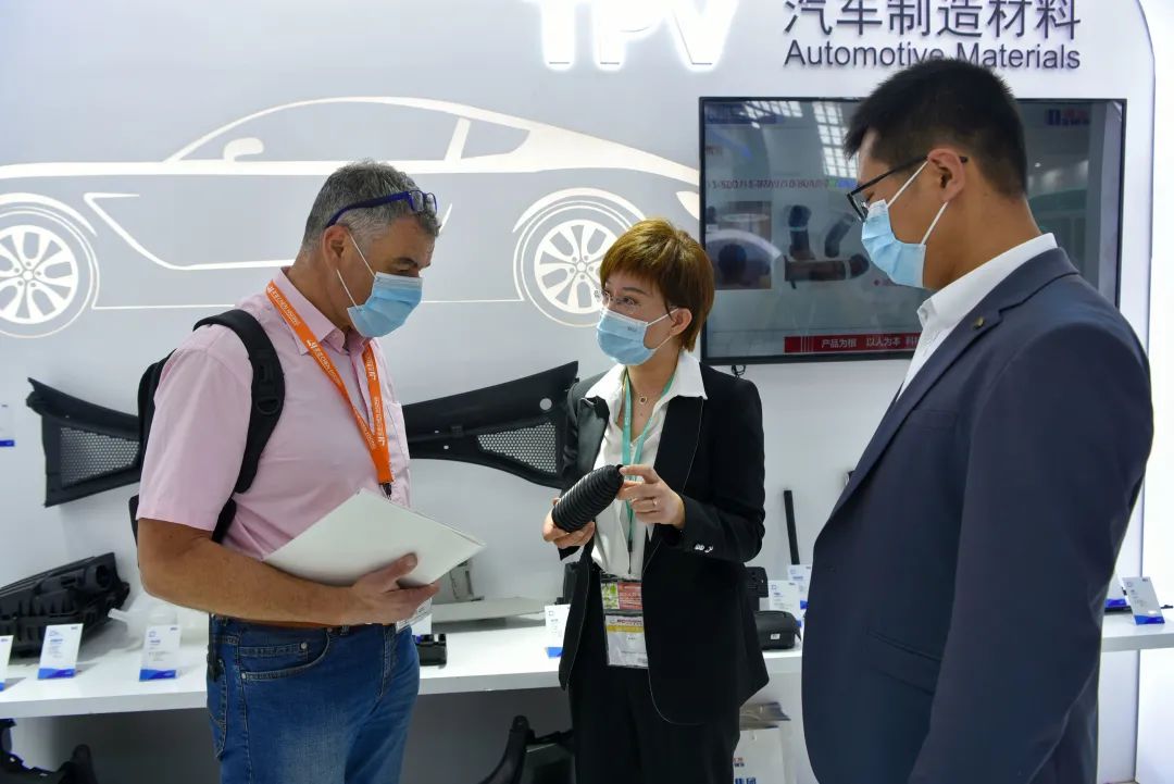 道恩展位上,電子屏滾動播放著反映企業發展歷程、戰略目標、科技研發、產品性能以及硬核抗疫等情況的視頻。參展人員熱情接待,詳細解答來訪客戶問題,充分介紹了道恩產品的優越性能。國內外知名展商慕名前往道恩展臺溝通洽談,其中不乏中煤集團、威高集團、海南逸盛、利安德巴塞爾、曼胡默爾、中國一汽、TCL、正泰電子、李寧等知名客戶。