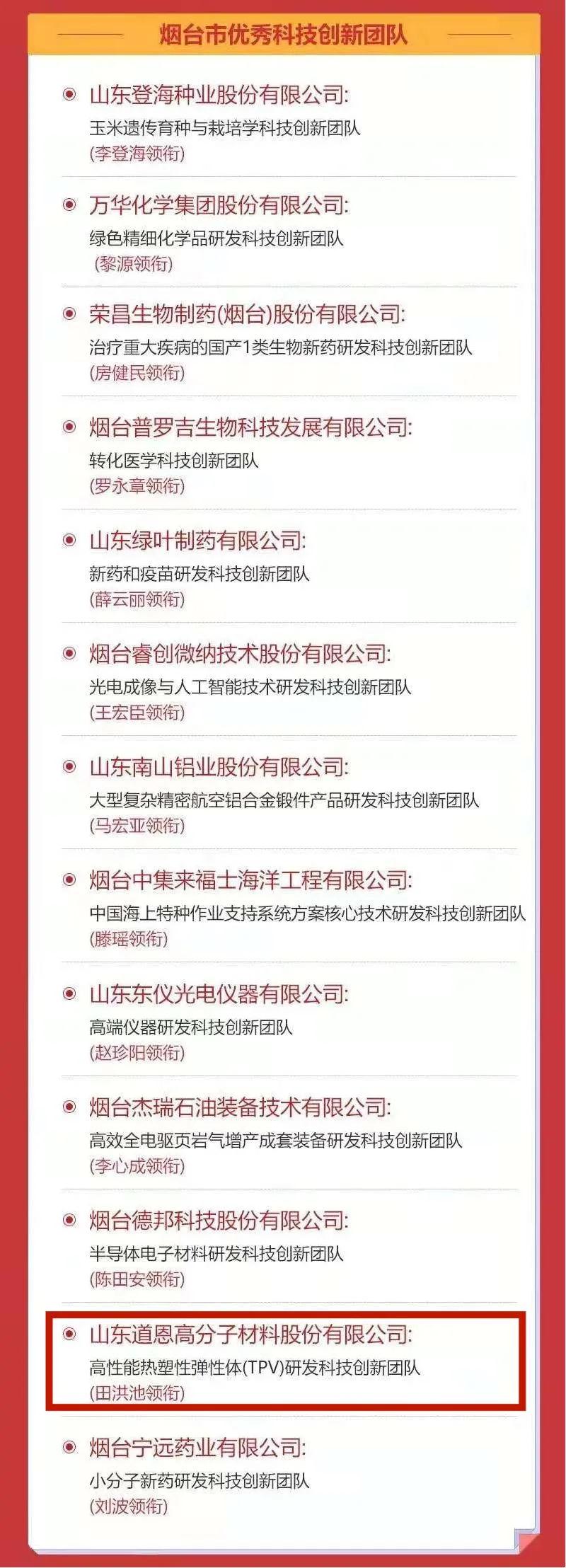 7月18日上午,在煙臺市企業家隊伍建設大會上,道恩集團被授予“2020年度煙臺市十佳功勛企業”;道恩集團董事長、總裁于曉寧被授予“2020年度煙臺市十佳功勛企業家”;由道恩股份總經理田洪池領銜的高性能熱塑性彈性體(TPV)研發科技創新團隊被授予“煙臺市優秀科技創新團隊”。