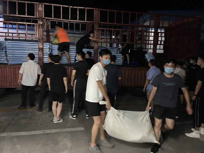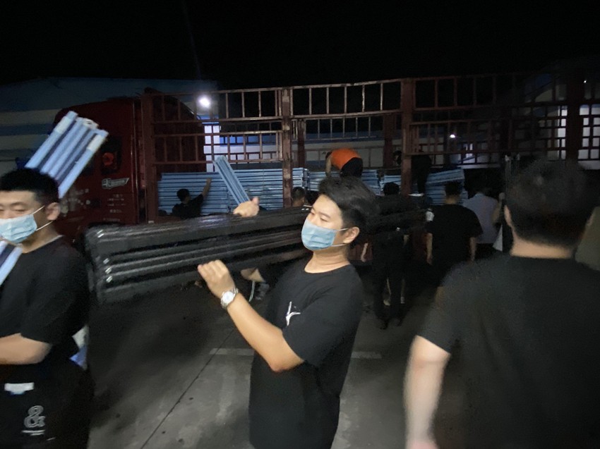 8月5日晚22時,運載遮陽棚的貨車駛?cè)氲蓝骷瘓F(tuán)總部駐地。一聲號令,行政管理部與道恩化學(xué)干部員工緊急集結(jié),加班加點接卸防疫物資。黑夜中,每一個腳步都堅實有力,每一次搬運都傳遞著愛心。大家爭分奪秒,再一次用行動詮釋了“道恩速度”。