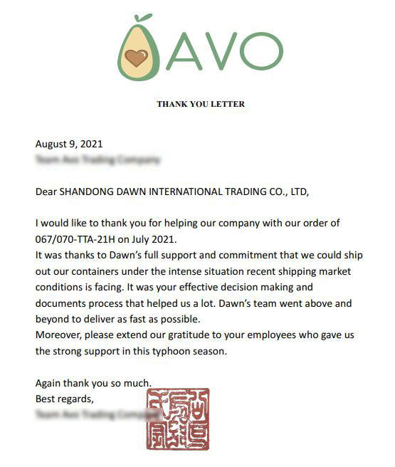 “對于最近船運緊張狀況下束手無策的我們,道恩的幫助是我們一直以來的希望所在。”8月4日,道恩國貿公司收到一封來自我國寶島臺灣的感謝信,委內瑞拉某公司臺灣子公司代表總部向道恩表達感謝之意。