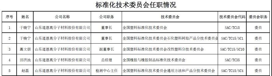 一流企業做標準,二流企業做品牌,三流企業做產品。作為國家認定的高新技術企業,道恩股份專業從事高分子新材料的研發及應用,產品涉及熱塑性彈性體、改性塑料、色母料、熔噴料及生物可降解材料等,多款產品躋身世界競爭舞臺。多年來,道恩股份積極參與各類標準的制修訂,培養了一批標準化專家,4名道恩人在全國性標準化技術委員會擔任5個委員,彰顯了道恩在標準化領域的行業地位和作用。