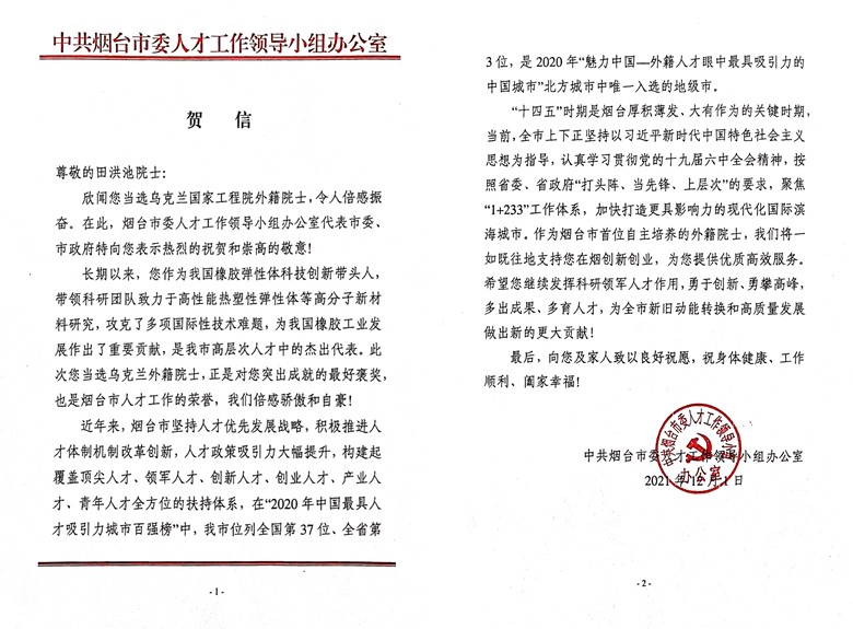 “此次您當(dāng)選烏克蘭外籍院士,正是對(duì)您突出成就的最好褒獎(jiǎng),也是煙臺(tái)市人才工作的榮譽(yù),我們倍感驕傲和自豪!”賀信飽含著煙臺(tái)市委、市政府對(duì)田洪池院士的祝福與關(guān)心,“作為煙臺(tái)市首位自主培養(yǎng)的外籍院士,我們將一如既往地支持您在煙創(chuàng)新創(chuàng)業(yè),為您提供優(yōu)質(zhì)高效服務(wù)。”