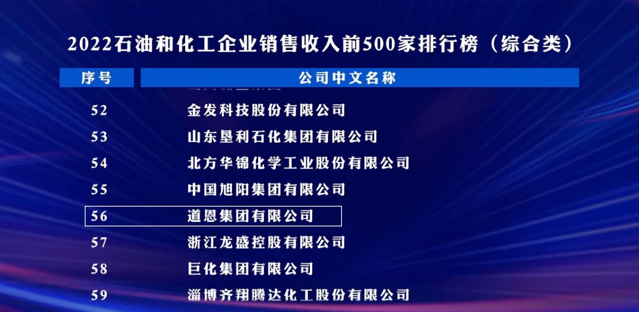 1130日,2022石油和化工企業銷售收入前500家發布會暨加快建設世界一流企業高峰論壇在北京召開,會上發布了2022石油和化工企業銷售收入前500家榜單,道恩集團位列綜合類企業第56,較去年上升6