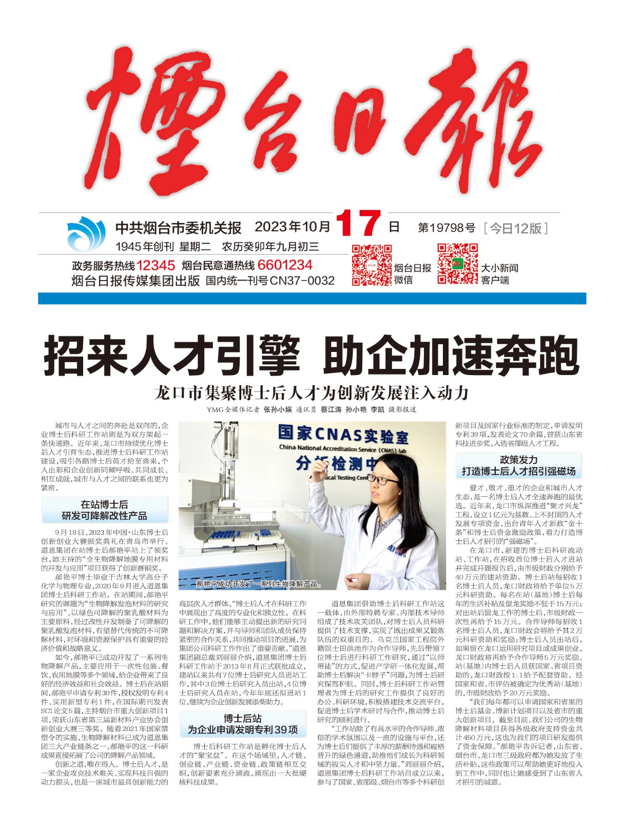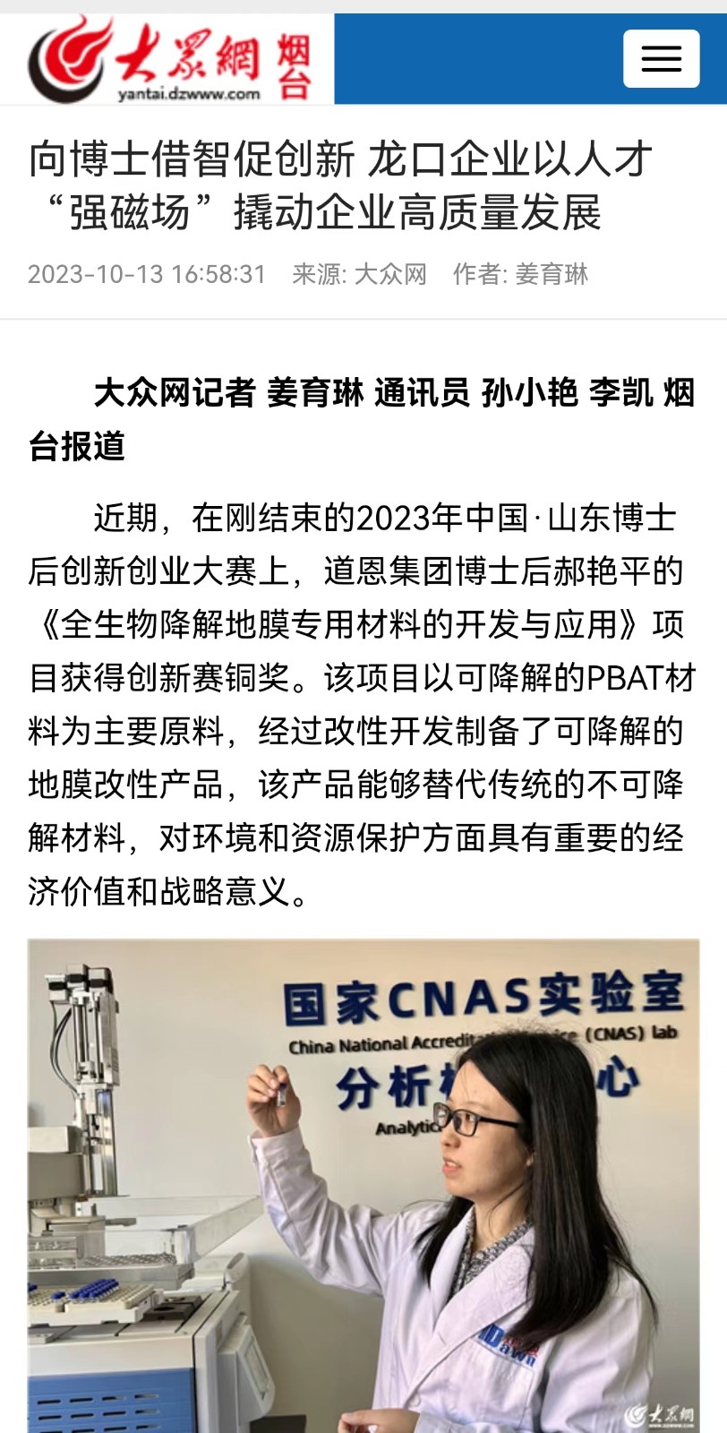 此前的9月18日,2023年中國·山東博士后創新創業大賽頒獎典禮在山東省青島市舉行。道恩集團在站博士后郝艷平站上了領獎臺,她主持的“全生物降解地膜專用材料的開發與應用”項目獲得了創新賽銅獎。據悉,這是龍口市唯一獲獎的博士后工作站項目。